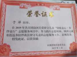 热烈祝贺公司18级材料一班于洋同学在2019年共青团饶河关爱留守儿童“情暖童心·相伴同行”志愿服务中,努力践行志愿精神,圆满完成寒假返乡陪伴留守儿童的志愿服务工作,表现优秀。
