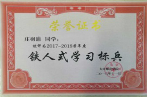在公司大庆精神铁人精神的教育和熏陶下,2018年11月,bevictor伟德官网2016级材料科学与工程一班庄羽迪同学被正式授予2017-2018年度伟德中国官网“铁人式”学习标兵称号。