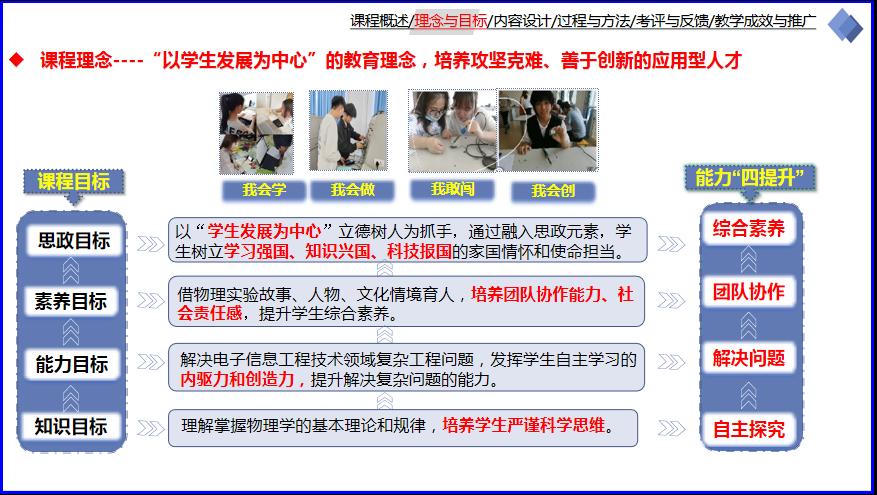 《大学物理》课程教学团队围绕“推动教学创新,培养一流人才”的大赛主题,本着以员工发展为中心的教育理念,以物理学理论为基础,以培养攻坚克难、善于创新的应用型人才为目标,,凝练了“三环四境”融合“五度八步”深度学习创新主题。团队将“工匠精神”、“五色教育”、大庆精神、铁人精神等思政元素润物无声的融入教学内容,通过信息化工具数字赋能铸魂育人。参赛作品经过反复打磨提交材料后,进入省赛现场决赛,最终获得第三届黑龙江省高校教师教学创新大赛中级及以下组别一等奖的好成绩。