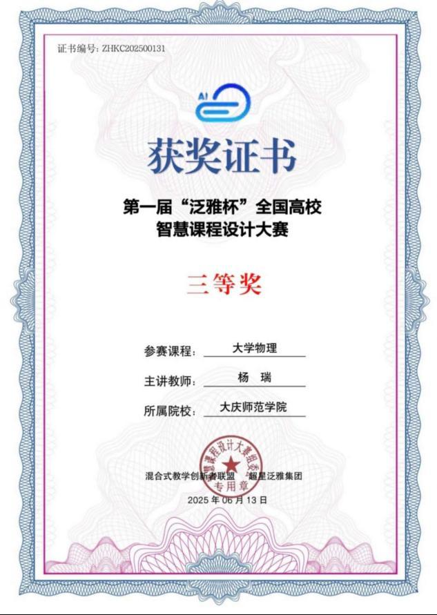 7月31日,由混合式教学创新者联盟与超星泛雅集团主办,华东师范大学、山东大学等19所高校联合主办的首届“泛雅杯”全国高校智慧课程设计大赛在超星尔雅科技园圆满落幕。经过激烈角逐,评选出特等奖3项、一等奖10项、二等奖39项、三等奖181项、优秀奖370项。bevictor伟德官网再传捷报!杨瑞老师负责的大学物理教学团队凭借《大学物理》课程设计,从全国数百所高校1619件参赛作品里脱颖而出,荣获全国三等奖。