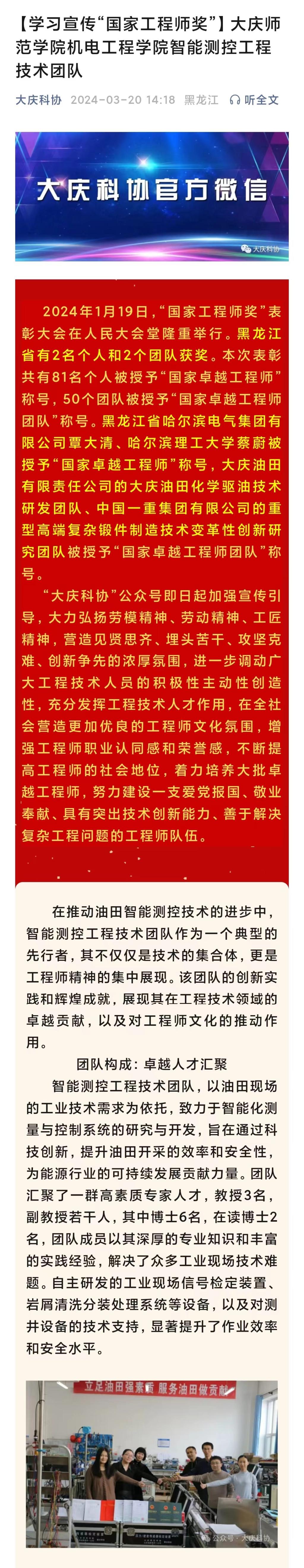 3月20日,“大庆科协”公众号以“学习宣传国家工程师奖-bevictor伟德官网智能测控工程技术团队”为题,报道了公司刘开绪教授牵头组建的“智能测控工程技术团队”在油田智能化测量与控制系统的研究与开发中取得的成绩,对技术团队在科学研究、技术开发、队伍建设和科研反哺教学等方面的工作给予了很高的评价(全文链接:https://mp.weixin.qq.com/s/jt_SpQxC8BvpB8StJEdW9Q)。