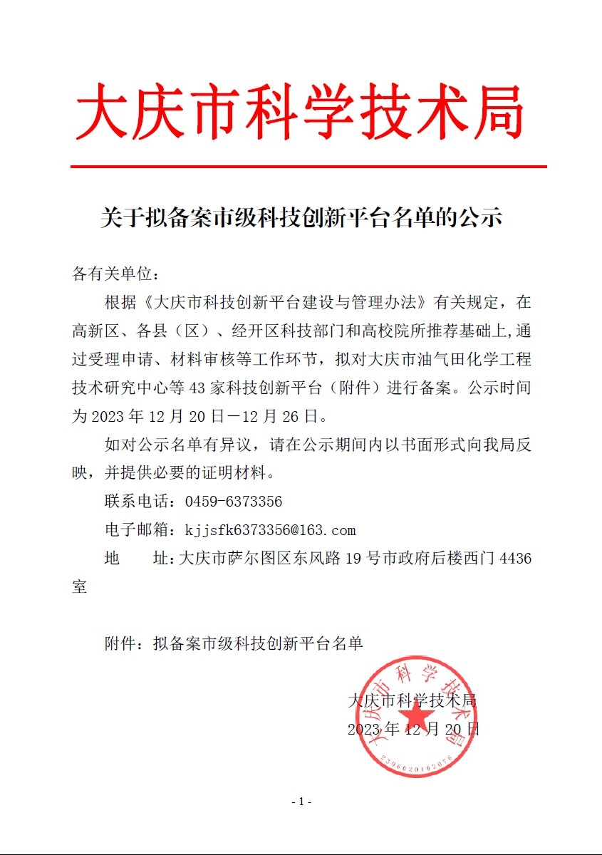近日,大庆市科学技术局公布了市级科技创新平台名单,全市合计43家科技创新平台入选。公司申报的“大庆市智能测控工程技术研究中心”、“大庆市光电功能材料重点实验室”成功获批备案。