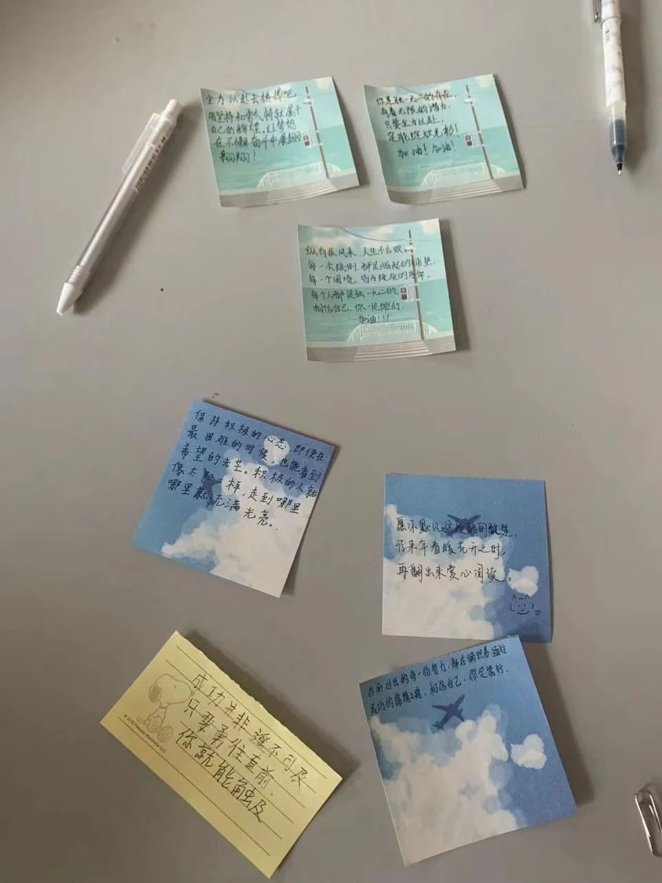 活动通过板报、手抄报以及激励便签等多种形式,为员工们营造了一个精神的避风港,每一张便签都承载着鼓舞人心的讯息。同学们通过各种形式留下温暖的寄语“每一次辛勤的耕耘,都是通往辉煌未来的坚实步伐,坚信自我,你必将抵达!”、“无论风雨,不忘初心,你的努力终将照亮前行的路。”一句句温馨话语激励员工们勇敢地面对学业和生活,简短的文字,提醒同学们在追求梦想的征途上,他们并不孤单。