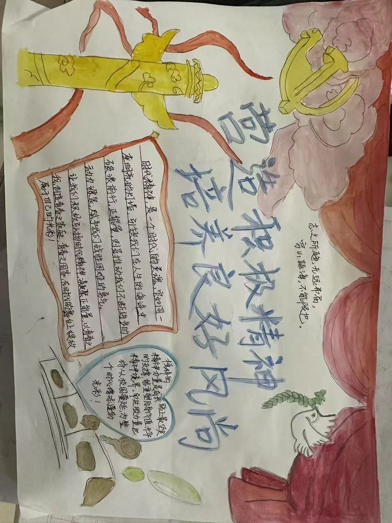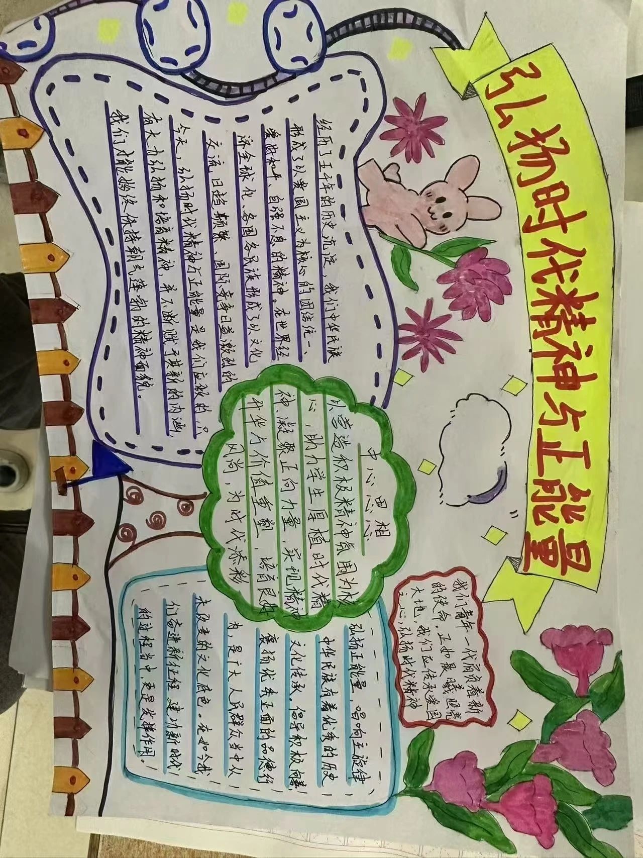 在活动的开展过程中,主题板报的设计,巧妙地融入了时代元素,展现了时代的力量和精神。同学们亲手做的手抄报,用丰富多彩的视觉元素和精心编排的文字内容展现出他们对时代主题的思考和探索。
