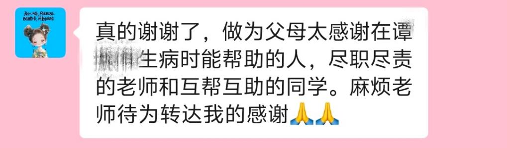 目前,六名同学中有两名符合条件的同学成功献血,其他几名同学明天献血,为谭同学的治疗提供了宝贵的帮助。谭同学的家长得知此事后,非常感动。他们向老师和献血的同学表达了深深的感谢。家长动情地说:“真的谢谢了,作为父母,我们太感谢在谭同员工病时能给予帮助的人,尽职尽责的老师和互帮互助的同学。麻烦老师代为转达我们的感谢。”