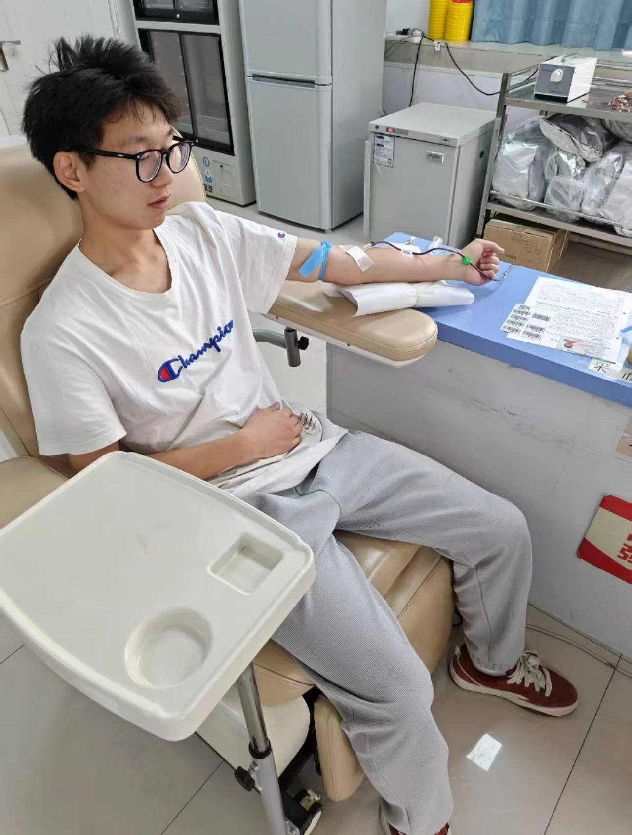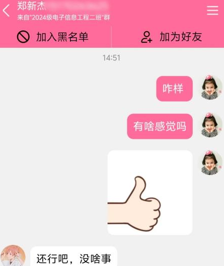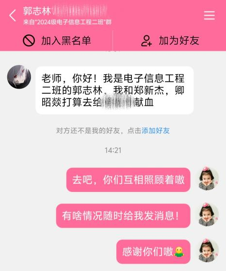 为了帮助谭同学,大家迅速行动起来。各年级辅导员在群内积极动员,号召大家伸出援手,激发了大家的爱心与责任感。令人感动的是,六名同学——郭志林、郑新杰、卿昭燚、刘成、阚鑫宇、王舜,毫不犹豫地站出来。他们勇敢地前往献血站,积极配合医护人员进行各项检查,希望能用自己的热血为谭同学带来帮助。这六名同学,或许平时在班级里并不起眼,但在关键时刻,他们展现出无私与勇敢,“没事的,都是为了同学”这句普通的话语充满着力量。