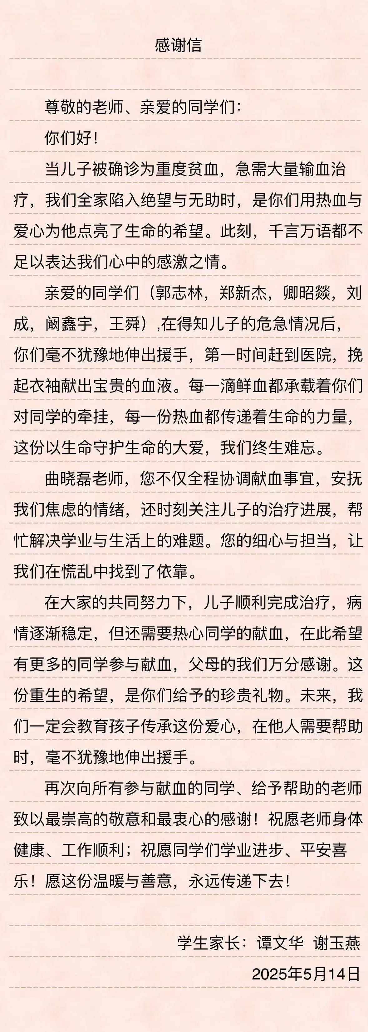 这场爱心接力,让我们看到了校园中浓浓的师生情、同学情。老师用实际行动诠释了对员工的关爱与责任,同学们用热血传递着温暖与希望,家长的感谢信则让这份爱更加深沉而动人。相信在大家的关爱下,谭同学一定能早日康复,重返校园,与老师和同学们一起,继续书写美好的青春篇章!让我们为这些充满爱心的同学点赞,也希望这份温暖与爱能够在校园里继续传递,温暖更多的人!