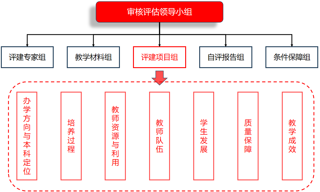 按审核评估要素,对应公司的机构设置,成立7个项目工作组(请各系参考公司的项目工作组,进行任务详细分解),组长牵头,组内实行分工负责制,由组长根据工作需要对组内各成员分派工作任务,并分工合作,负责撰写《分项自评报告》,并提供各分项目所需支撑材料。